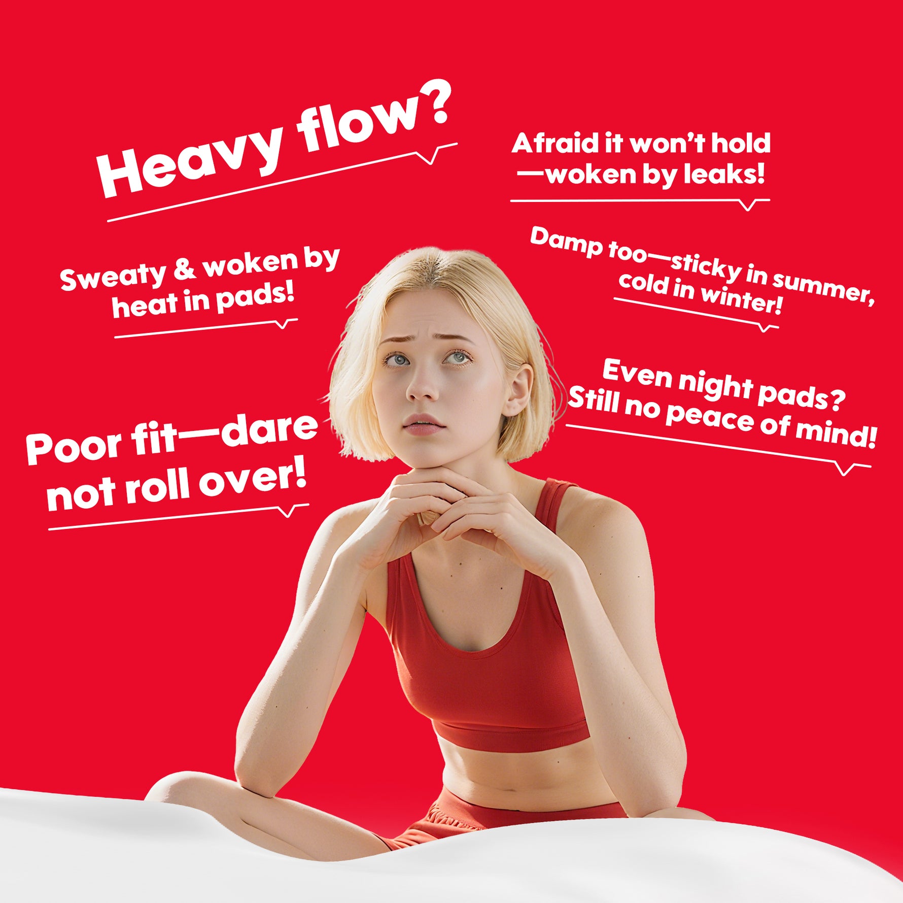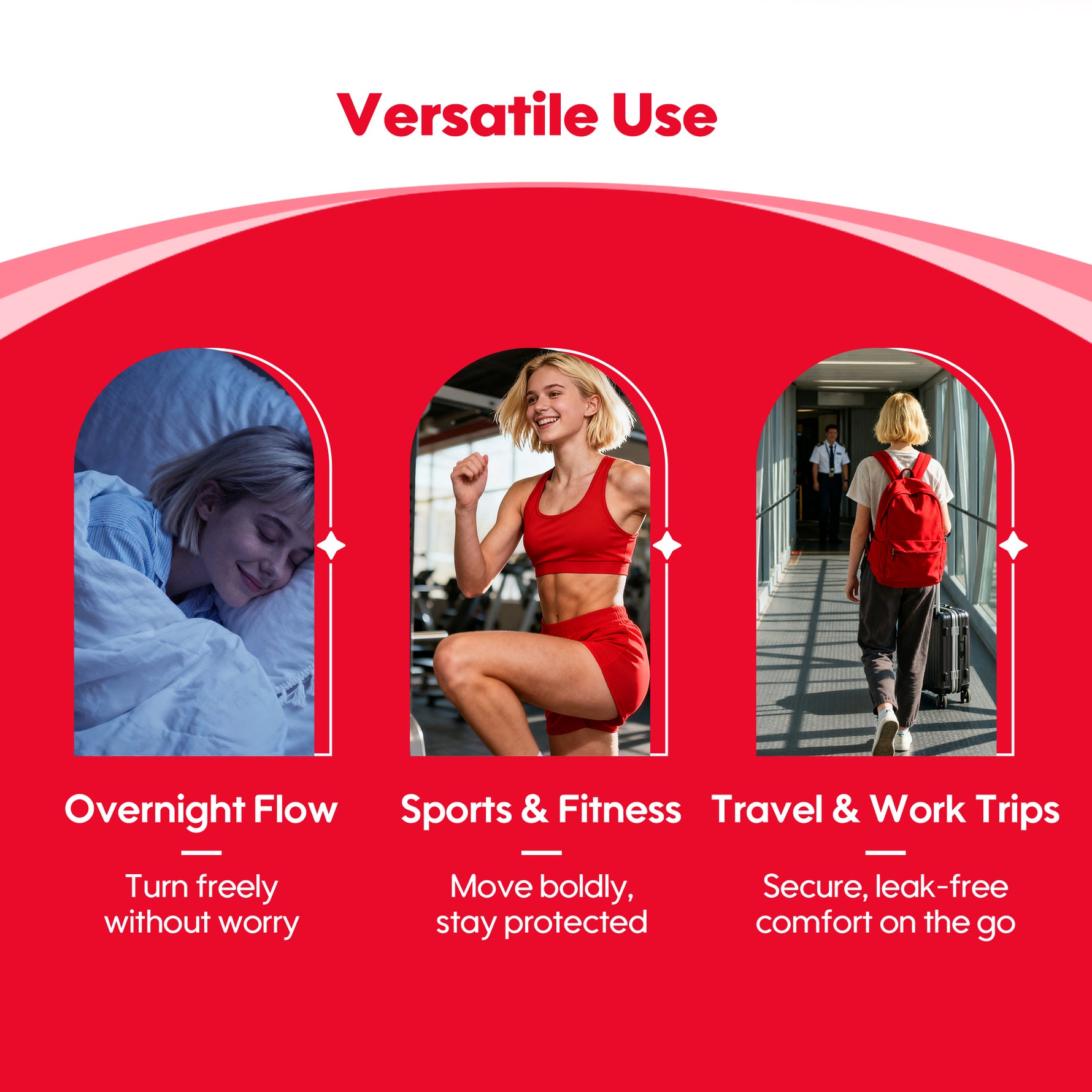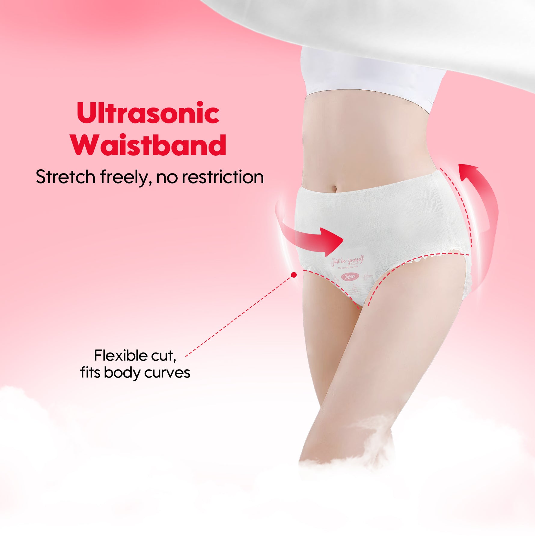 Sleep through heavy-flow nights—360° 5D leak-proof shield locks fluid in every position. Ultrasonic waistband keeps spandex stretchy, hugging waist and abdomen without roll or pinch. Feather-light, cloud-soft, billions of micro-pores release heat and moisture for zero stuffiness. Ultra-absorbent core pulls liquid instantly, prevents backflow up to 12 hours; wake dry, stain-free. Slip on like normal underwear, tear sides for instant disposal—no pad, no wash, no worry. Travel, work, yoga, bedtime: move freely, just be yourself.