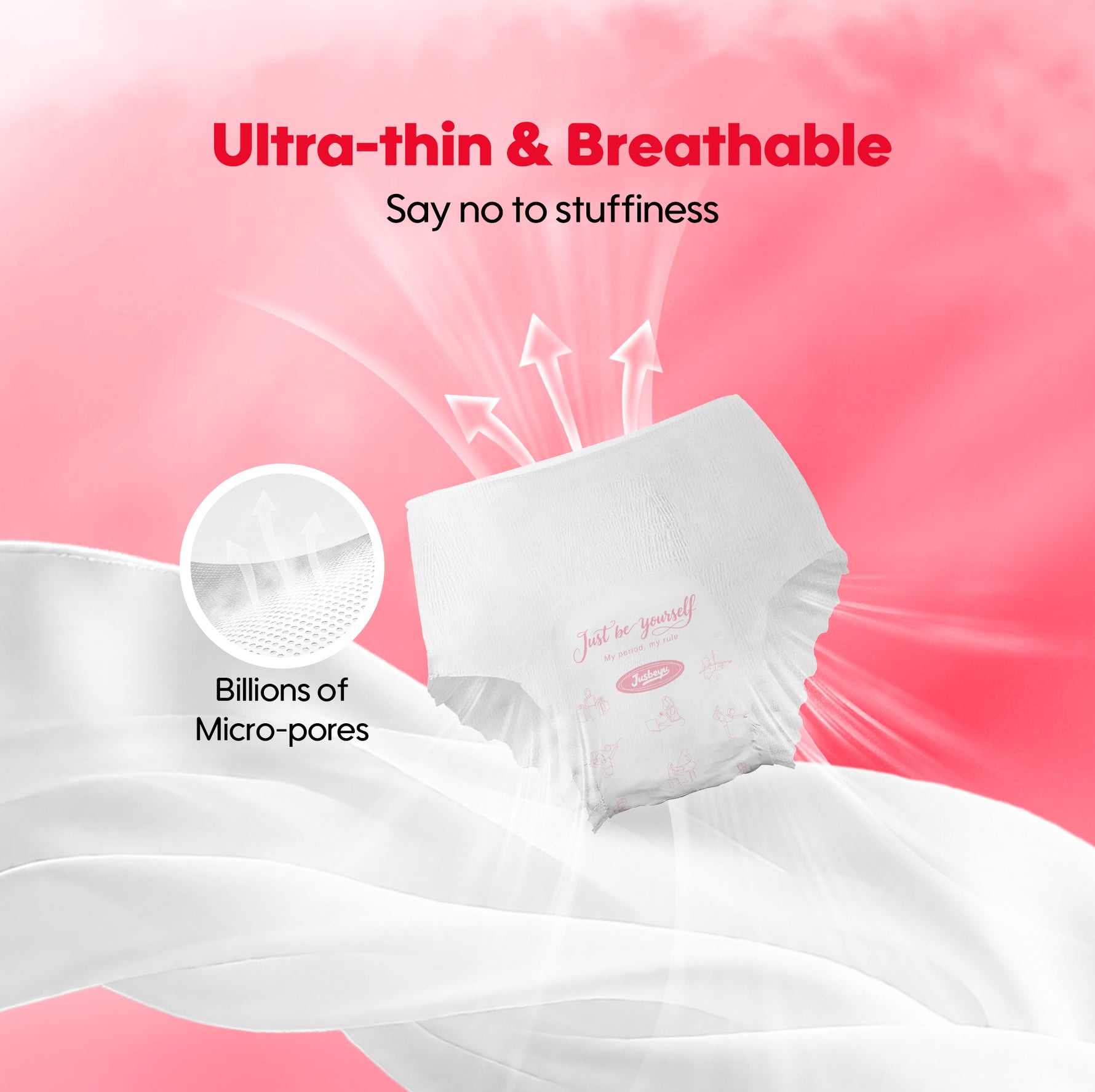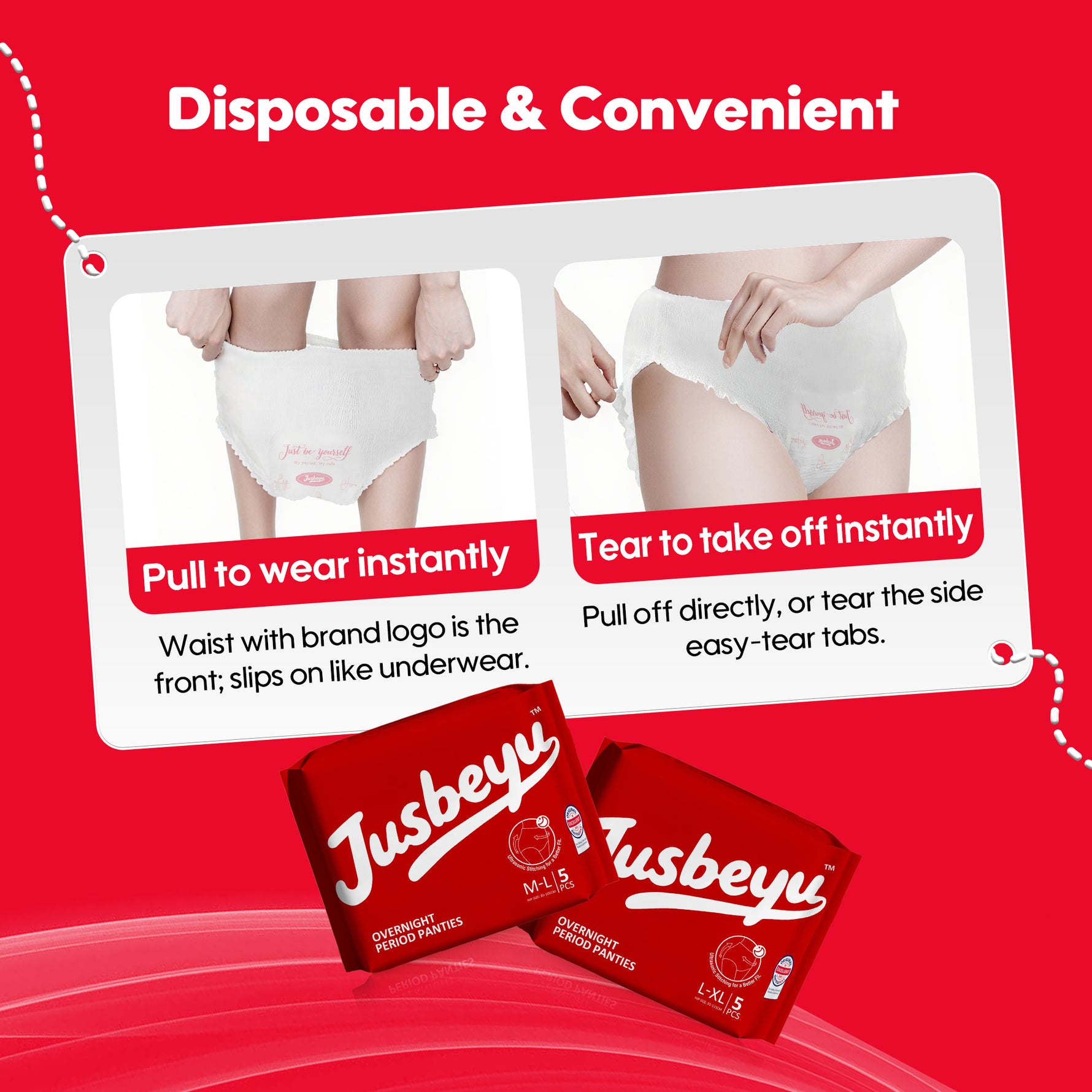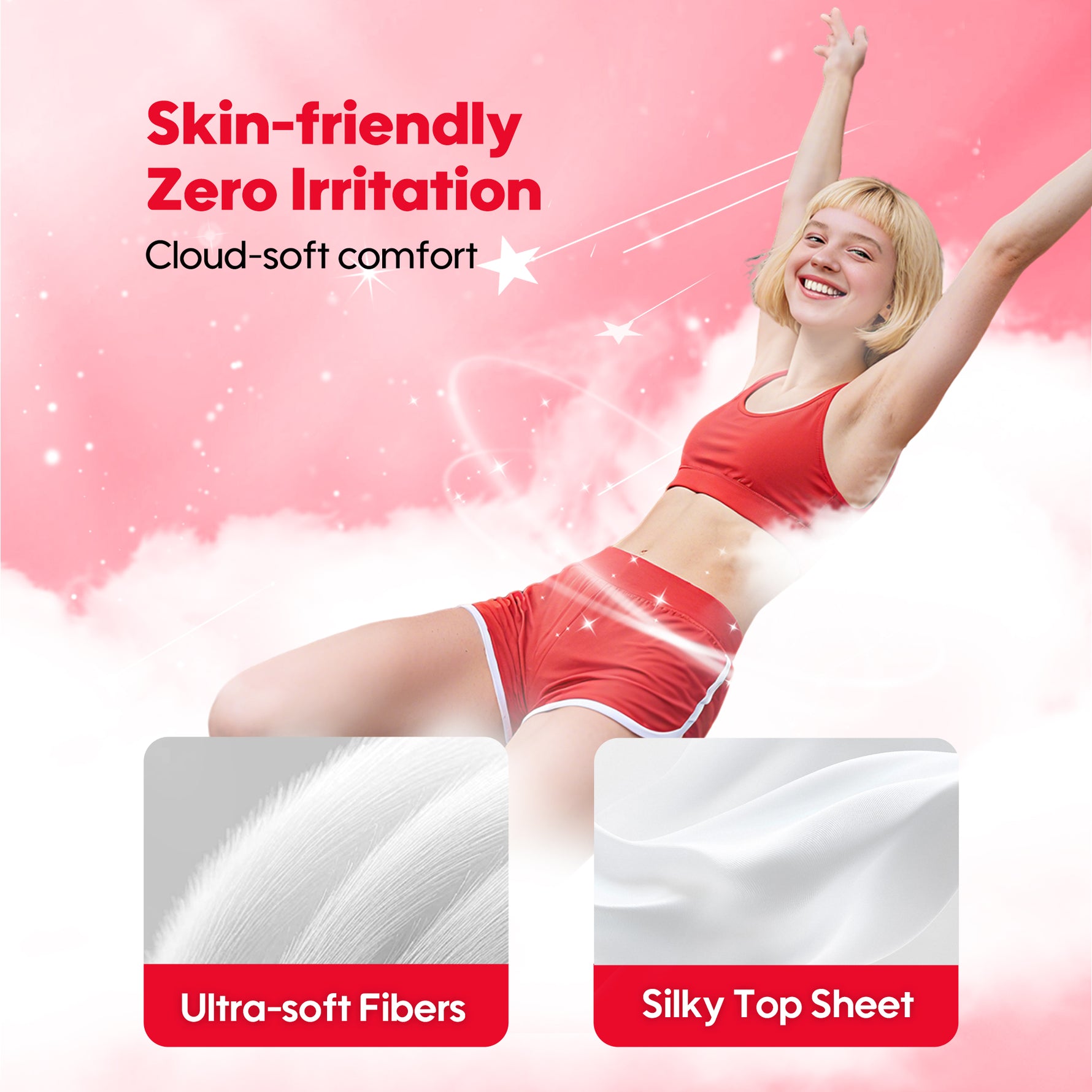 Sleep through heavy-flow nights—360° 5D leak-proof shield locks fluid in every position. Ultrasonic waistband keeps spandex stretchy, hugging waist and abdomen without roll or pinch. Feather-light, cloud-soft, billions of micro-pores release heat and moisture for zero stuffiness. Ultra-absorbent core pulls liquid instantly, prevents backflow up to 12 hours; wake dry, stain-free. Slip on like normal underwear, tear sides for instant disposal—no pad, no wash, no worry. Travel, work, yoga, bedtime: move freely, just be yourself.