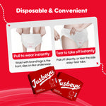 To change them, you don't need to take off your pants or skirt. Just tear open the easy-tear sides like a bandage, pull the used part out from the side, and then put on a new pair. Slide the new ones up one leg, adjust to a comfortable fit, and secure the side velcro tabs. The whole process can be completed in under 15 seconds.