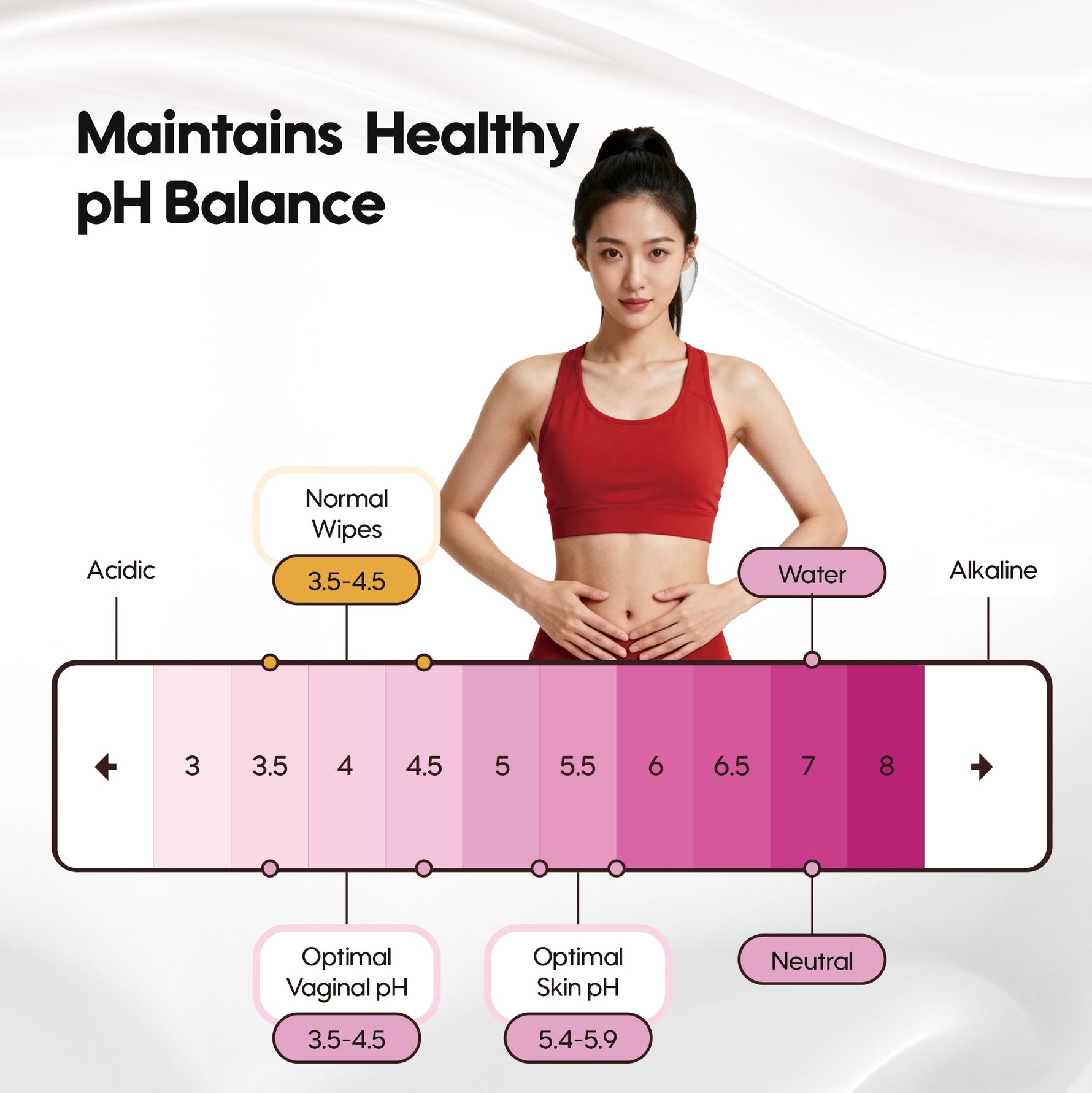 Specifically designed for intimate areas, the wipes maintain a healthy pH balance between 3.5-4.5. This helps preserve a healthy, mildly acidic environment, balancing the bacterial flora and effectively eliminating odors.
